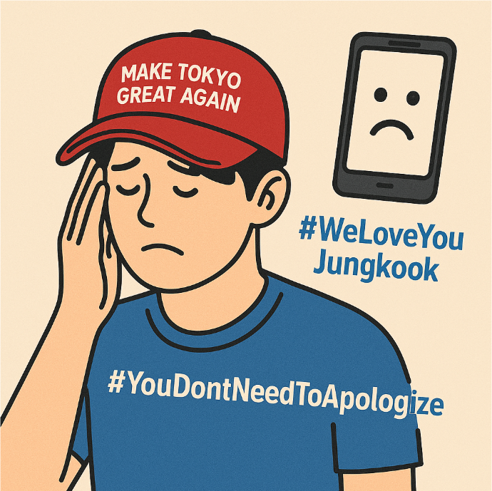 2025년 6월 13일, BTS의 정국이 J-Hope 단독 콘서트 리허설 중 “Make Tokyo Great Again” 문구가 새겨진 모자를 착용해 팬과 대중 사이에서 큰 논란이 일었습니다. 이에 정국은 즉각 사과하고 모자를 폐기했다고 밝혔습니다.